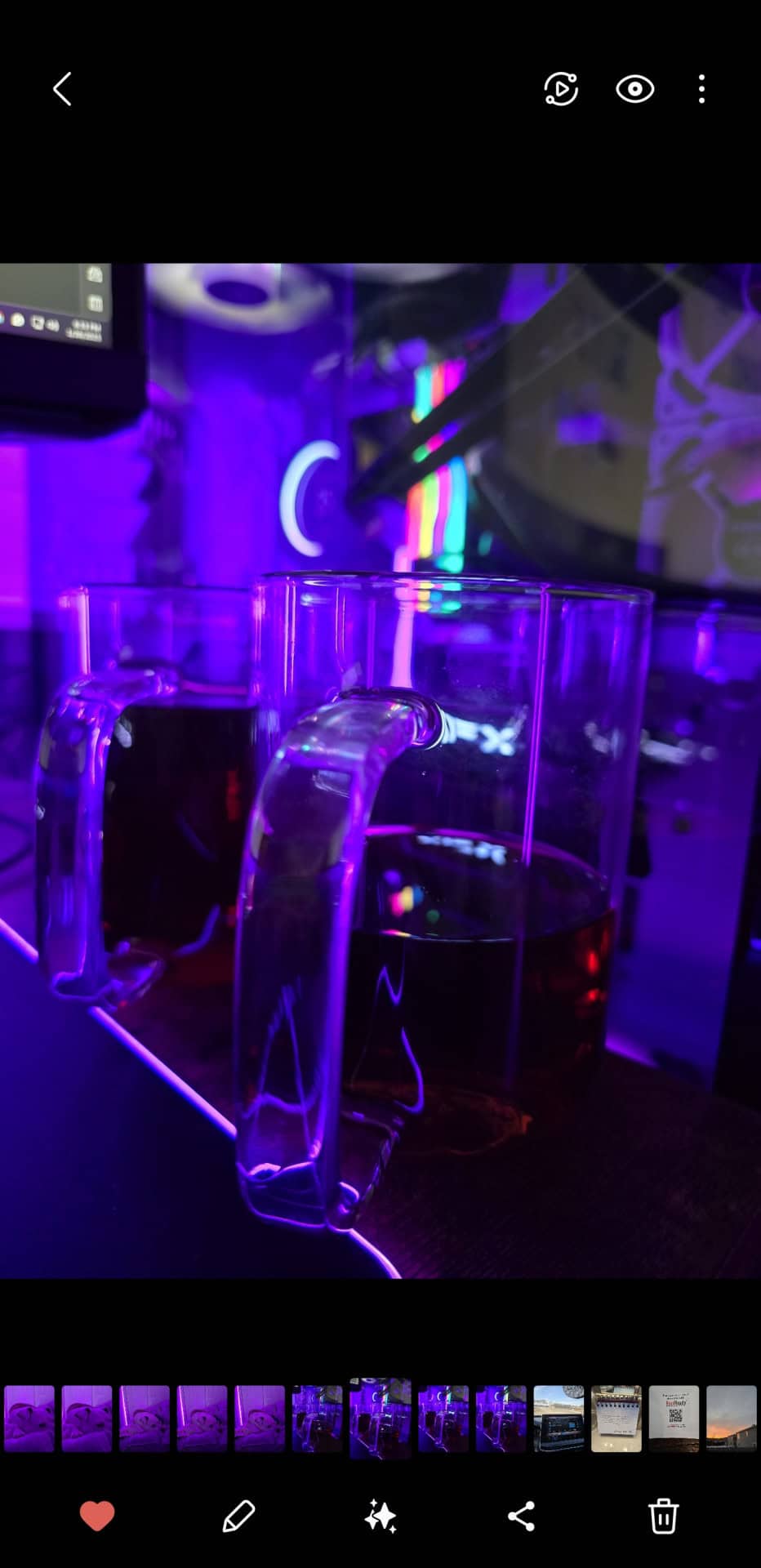 In the calm of the night, glowing purples and radiant hues reflect off glass mugs, capturing a tranquil, futuristic vibe. #CyberAesthetic #LateNightVibes #NeonMood #SereneMoments ????